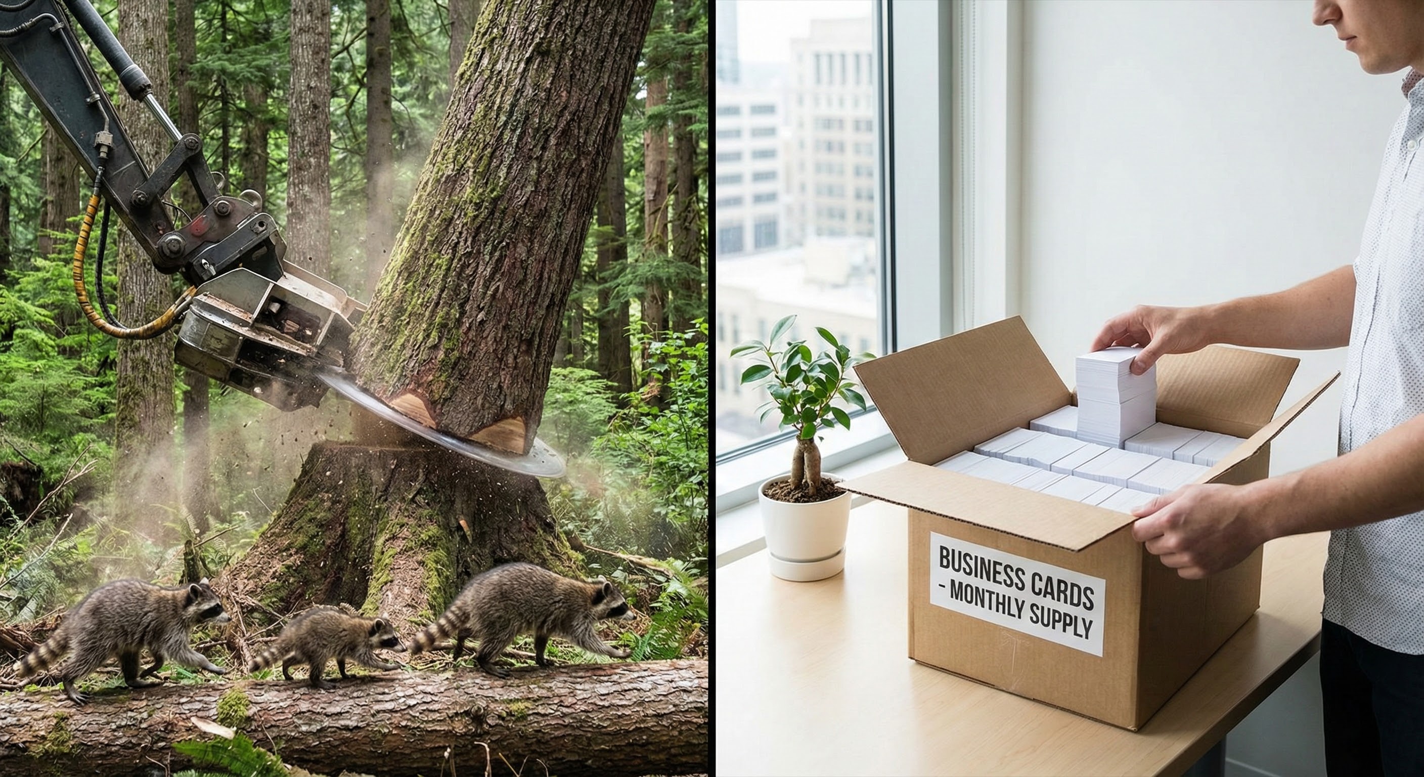 A single standard business card has a surprisingly large environmental footprint. Per 1,000 cards: 0.05 trees, 22 gallons of water, 4.4 lbs of CO2, and 2.2 lbs of waste (88% become trash).